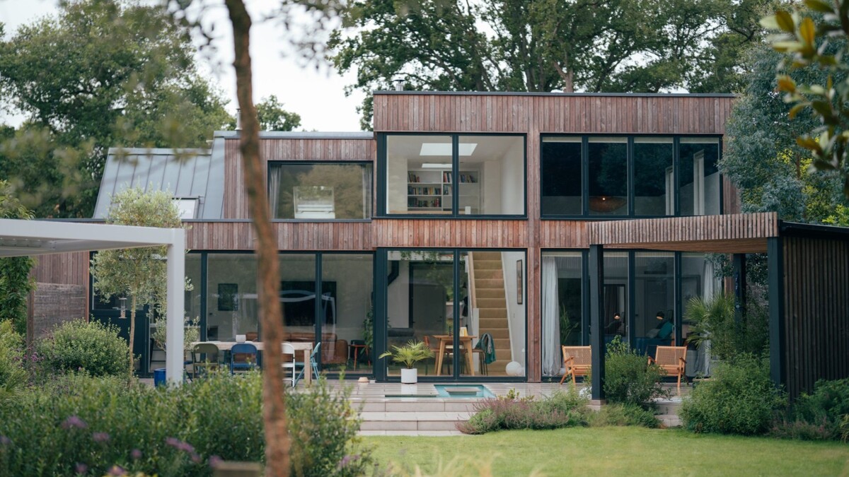 Constructed with a highly insulated timber frame and engineered steelwork, the home delivers excellent energy efficiency. Natural larch cladding, composite timber-aluminium windows, an air-source heat pump with underfloor heating, and a recyclable standing seam steel roof complete this stiking contemporary design, which blends seamlessly with its Mediterranean inspired garden.
