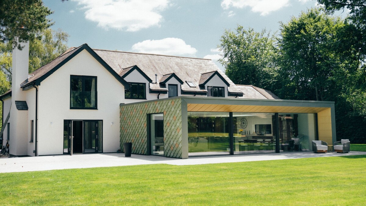 · Large extensions clad in distinctive green Pretty Plastic tiles, appearing like dragon scales, create a striking appearance while blending with the garden.